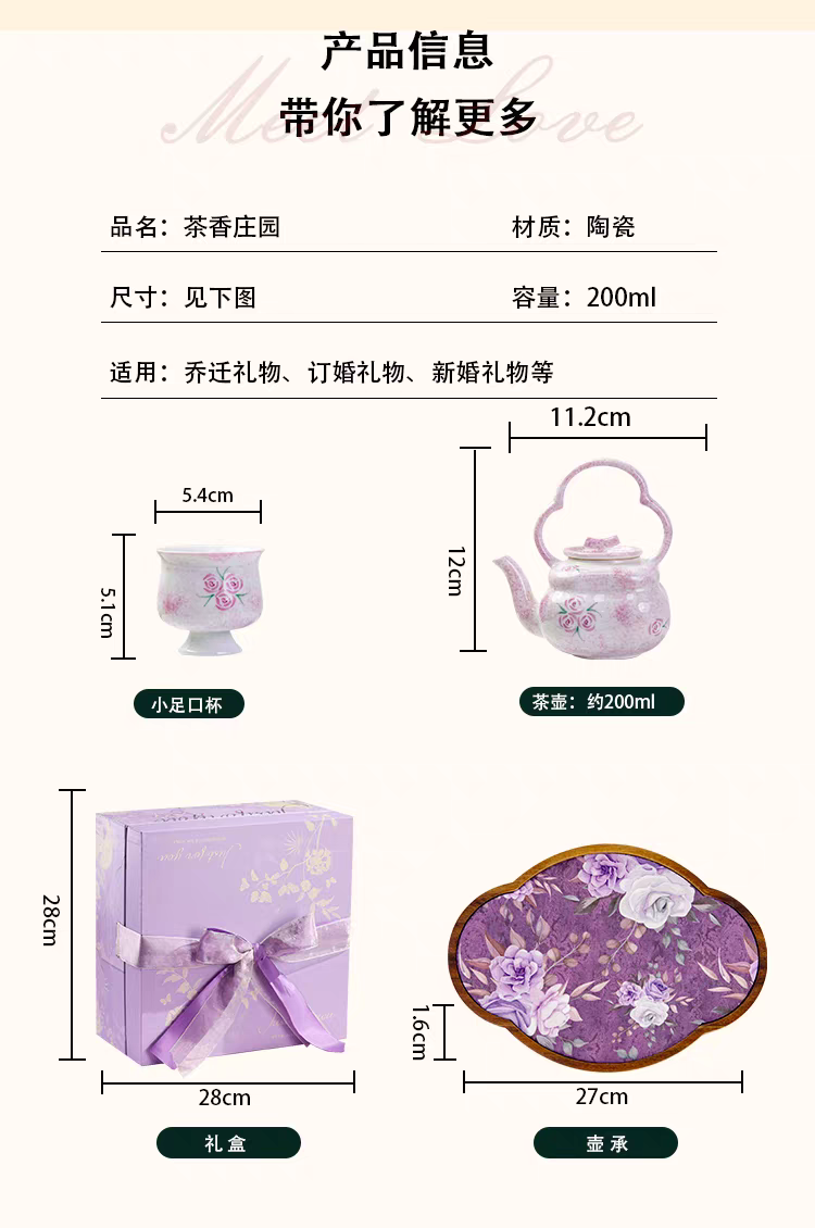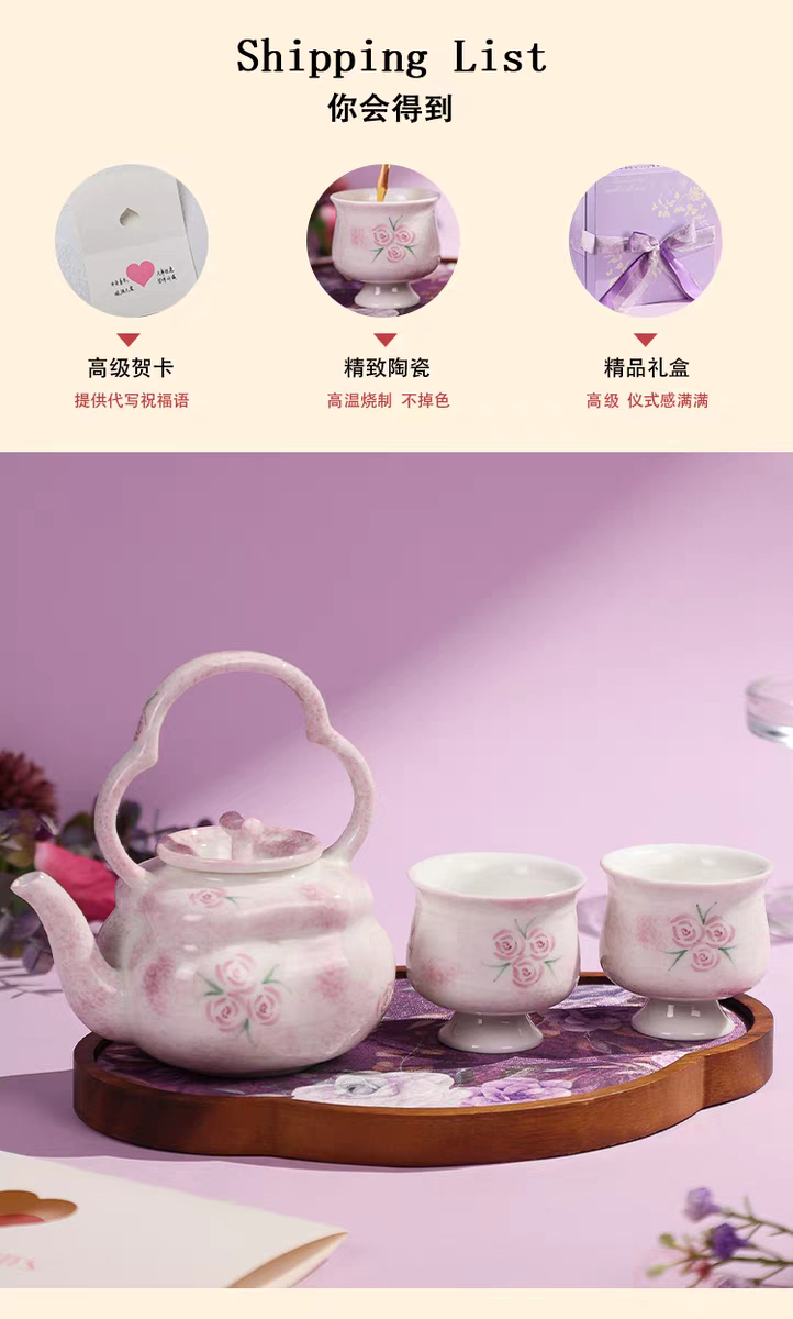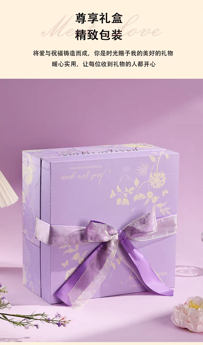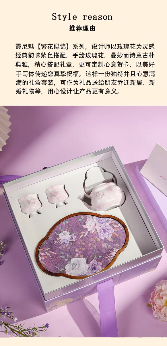 霞尼魅【繁花似锦】系列,设计师以玫瑰花为灵感经典韵味紫色搭配,手绘玫瑰花,曼妙而诗意古朴典雅,精心搭配礼盒、更可定制心仪贺卡,以美好手写体传递您真挚祝福,这样一份独特并且心意满满的礼盒套装,可作为礼品送给朋友乔迁新居、新婚礼物等,用心设计让产品更有意义。