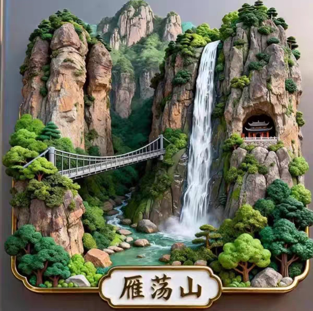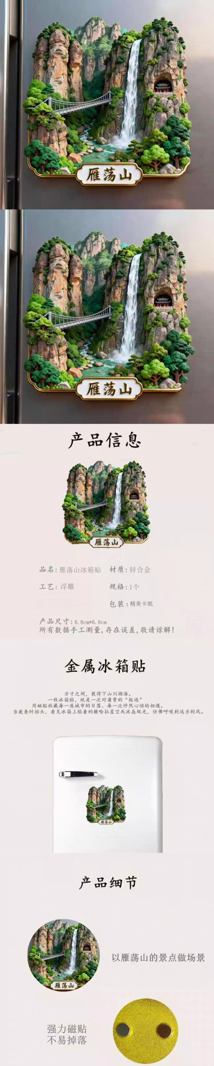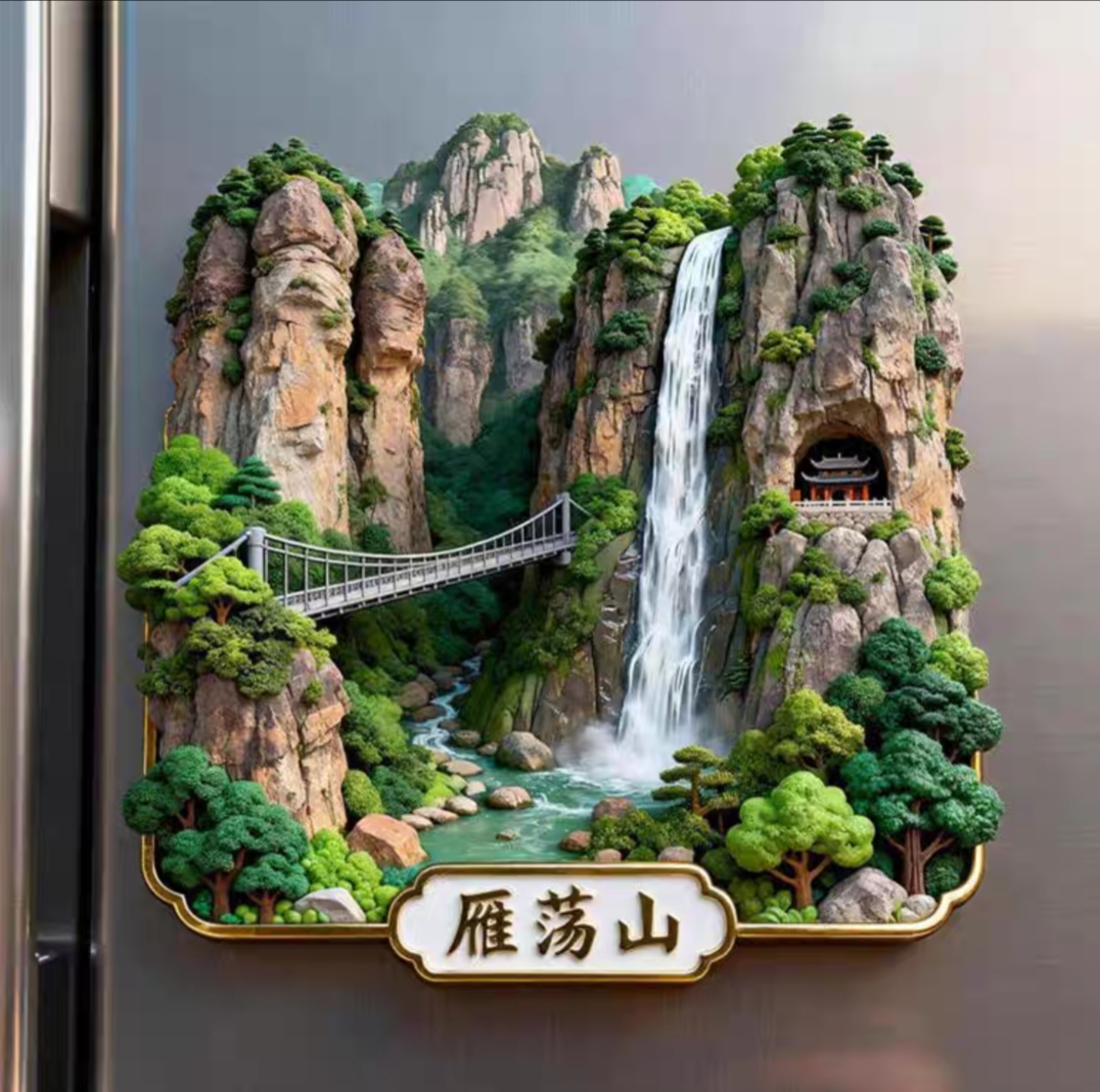 是以锌合金为基底,经激光蚀刻与局部珐琅彩工艺,精准还原灵峰、灵岩飞渡等地质奇观,山体轮廓误差≤0.3mm。内置钕铁硼磁芯,双层结构承重达200g。色泽持久,耐刮耐磨特性。仅18g却质感沉甸,可贴于冰箱、铁门等,既是旅行纪念,也是家居艺术摆件,附带编号证书,收藏价值显著。