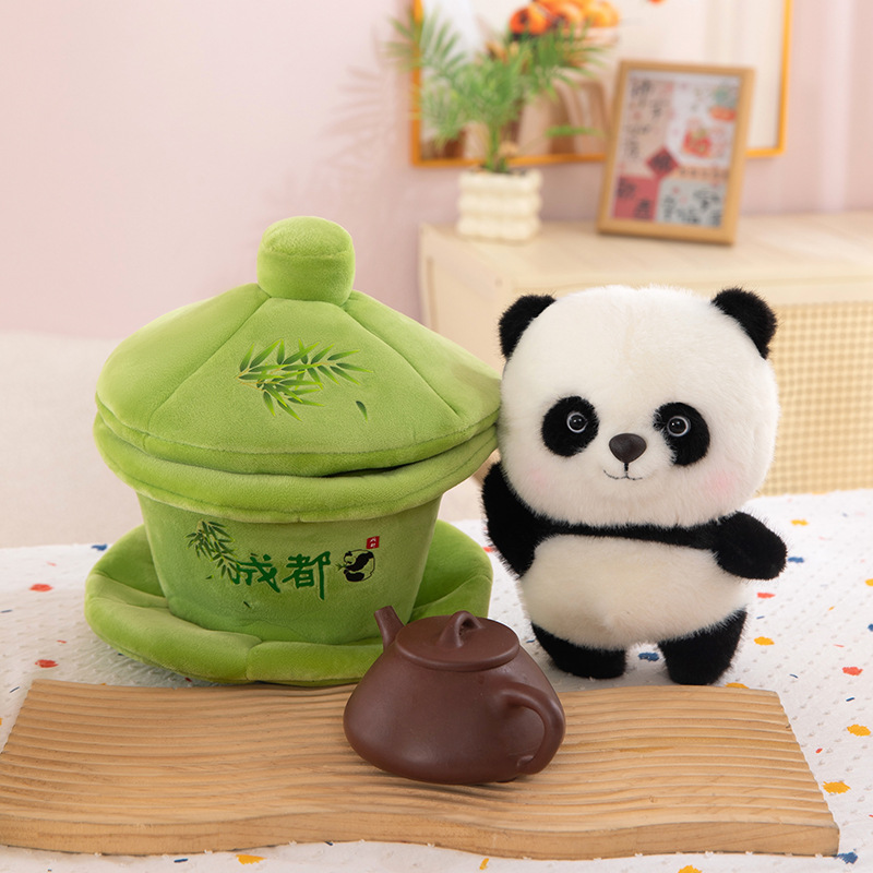 当国宝熊猫邂逅川渝名片盖碗茶,便诞生了这款自带文化温度的毛绒玩具,既是萌趣玩伴,更是可触摸的地域文化符号。玩具整体采用“熊猫+盖碗茶”的创意融合设计,主体熊猫造型圆润软糯,优选超柔短绒面料,触感如云朵般细腻亲肤,不掉毛、不褪色,给孩子与成人都能带来安心的拥抱体验。熊猫坐姿憨态可掬,双手捧着一只迷你仿真盖碗茶——碗身印着浅淡的蜀绣竹纹,茶盖、茶碗、茶托三层结构可拆卸,细节处还原盖碗茶的经典形态,把玩间尽是川渝生活的闲适意趣。尺寸上提供两种选择,18cm便携款可轻松塞进背包,陪伴你通勤、旅行;30cm抱睡款则适合放在床头、沙发,既是装饰摆件,也是治愈情绪的“软乎乎伙伴”。内置高弹PP棉填充,按压后快速回弹,久抱不变形,无论是送给孩子当礼物,还是送给外地朋友作为川渝伴手礼,亦或留给自己收藏,都能传递一份独特的文化心意与温暖。
