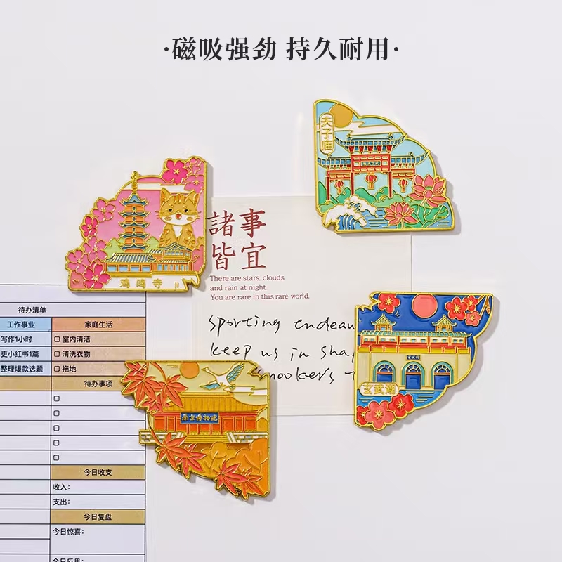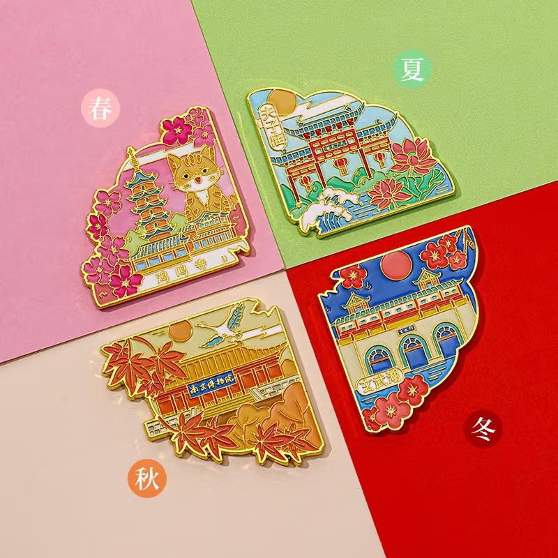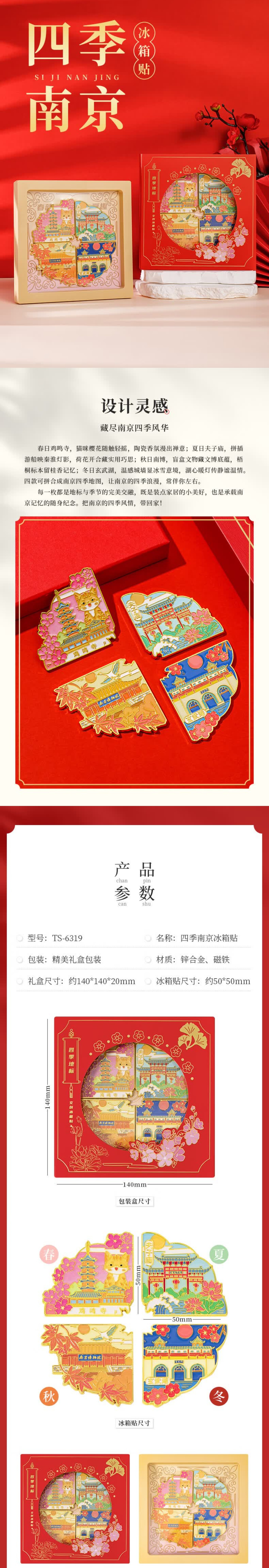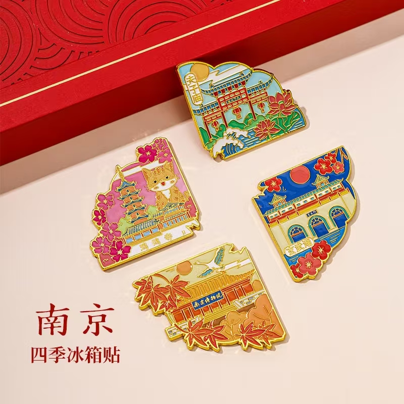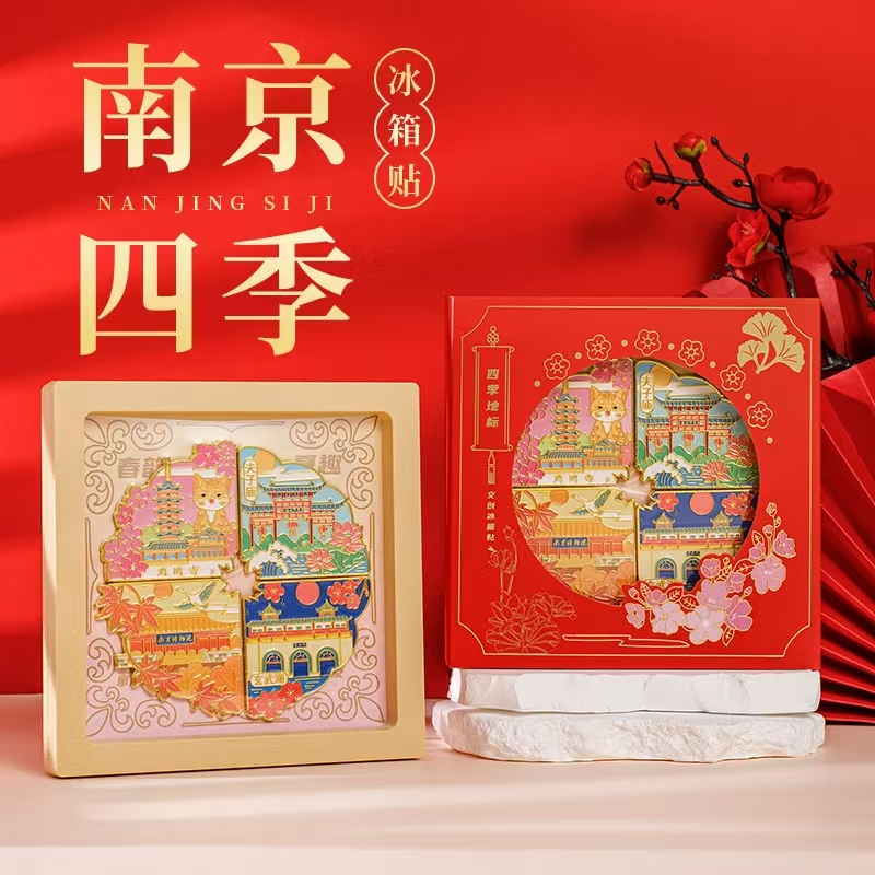 四季流转,南京之美尽在掌心。这组冰箱贴以南京地标为灵感,将春夏秋冬的城市风情浓缩成可拼接的地图,锌合金与珐琅工艺打造,色彩绚烂、质感高级。礼盒装设计精美,既是家居装饰,也是城市记忆的珍藏,让南京的四季,永远陪伴你。