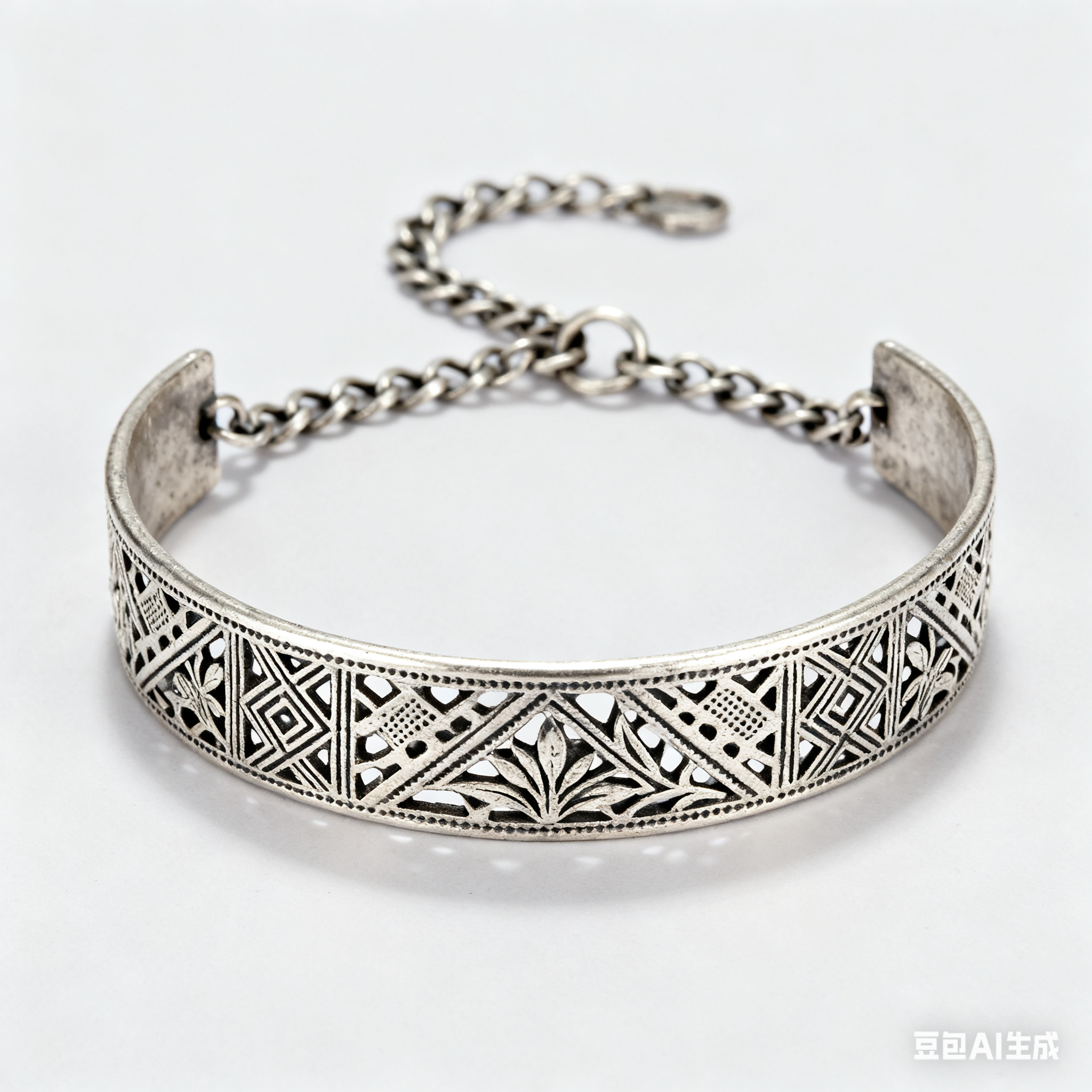 贵州苗族镂空花纹银饰手链:精选苗银材质,表面经抗氧化处理。链身雕刻太阳花与回纹组合图案,搭配可调节扣头适配不同手腕。银饰光泽柔和,佩戴舒适,是传统工艺与现代审美的结合。