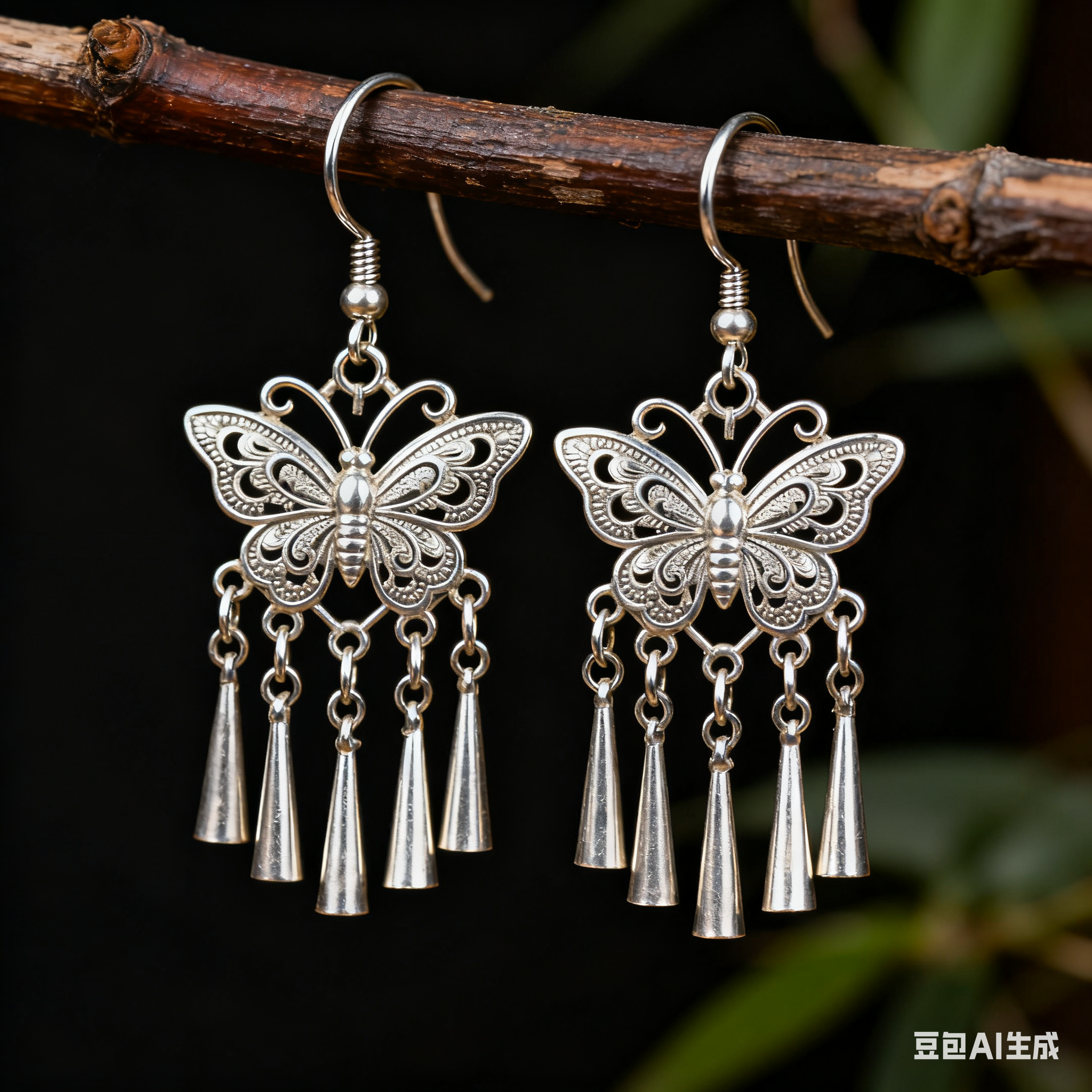 贵州苗族蝴蝶纹银饰耳环:以苗族图腾蝴蝶为灵感,999纯银手工打造。翅膀纹路精细錾刻,边缘打磨光滑,耳钩处做防过敏处理。整体轻盈灵动,佩戴时摇曳生姿,尽显苗族文化韵味。