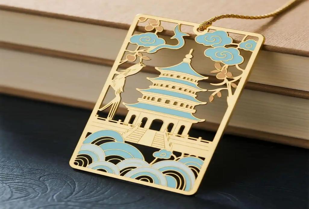 多采用黄铜或合金材质,经过27道工序精工打造,厚度控制在0.8mm的黄金比例,既保证分量感又避免损伤书页。表面采用仿古做旧工艺或珠宝级电镀工艺,呈现青铜质感或故宫红墙色,耐磨不掉色。