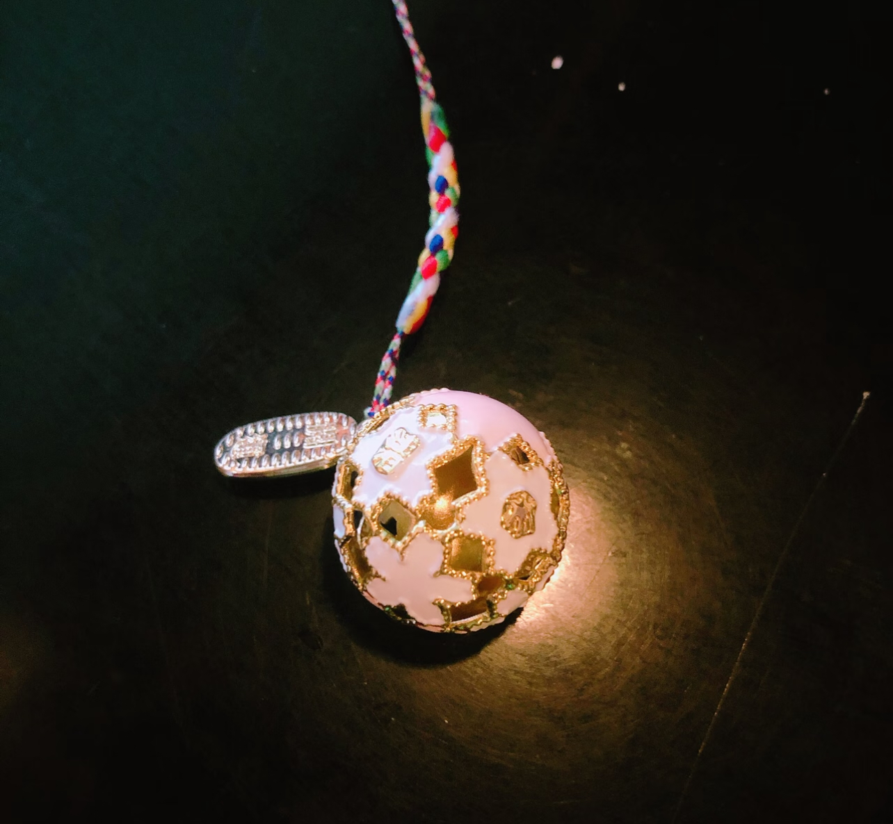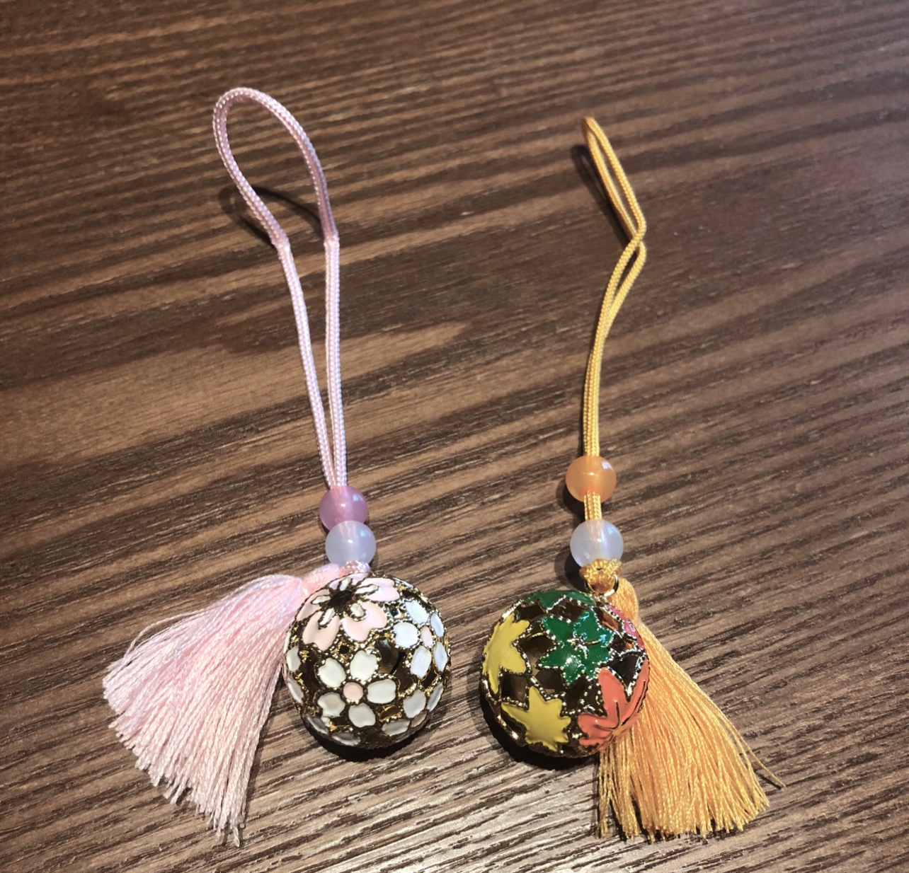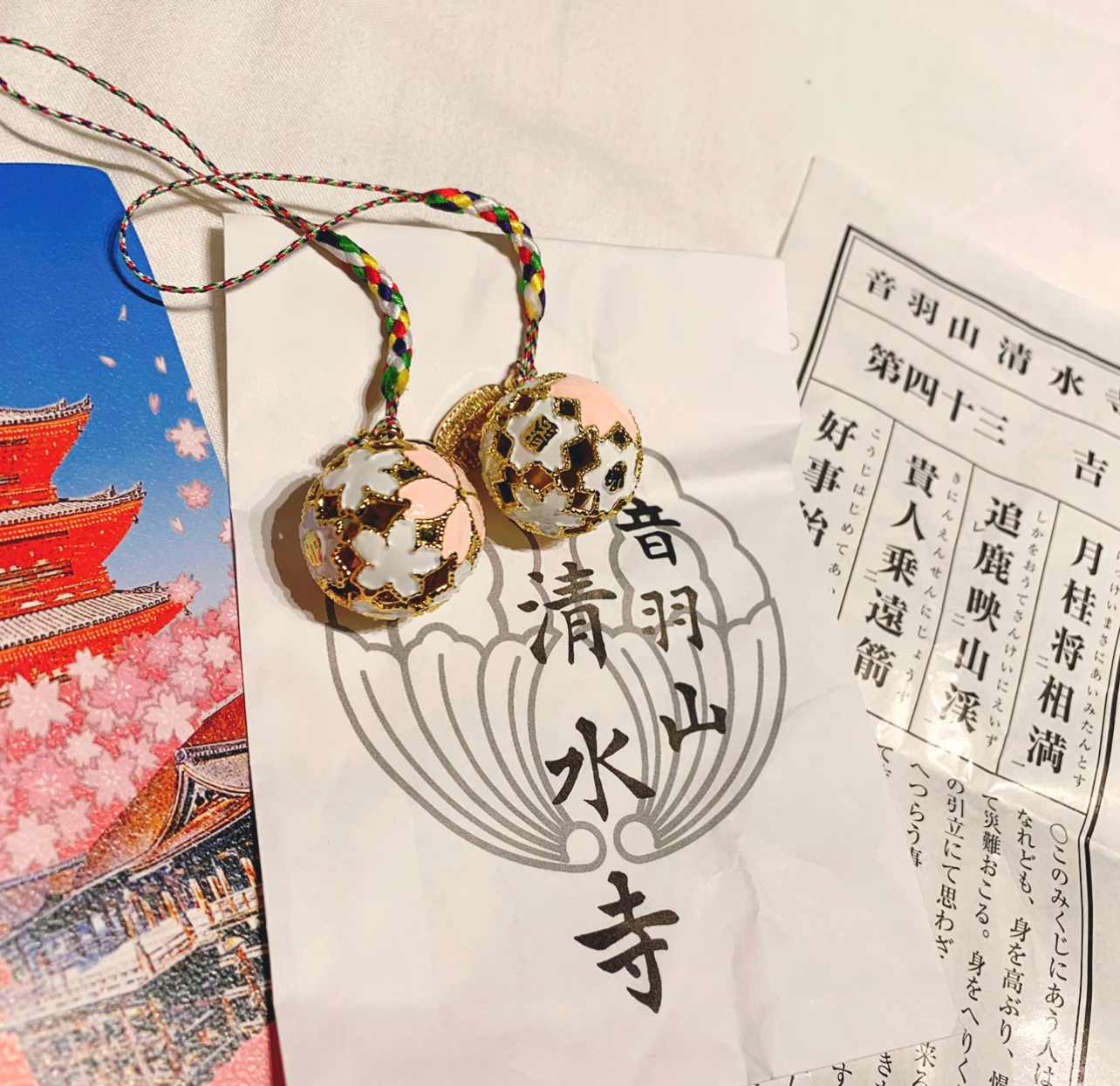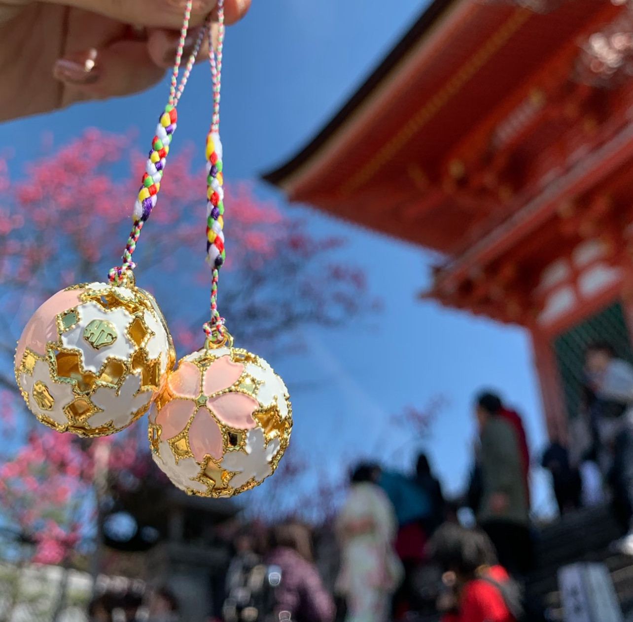 清水寺御守铃铛通常指的是开运樱铃,它是清水寺的招牌御守之一。外观设计:铃身直径约2.3cm,采用铜胎珐琅工艺,为双层结构。外层是镂空樱花纹,白粉渐变的樱花浮雕搭配金箔勾边,内层是镀金响片,绳结为五股编织唐组。 文化寓意:具有“福运、除厄、姻缘”三重寓意,传说携带它可以驱走厄运,带来好运。