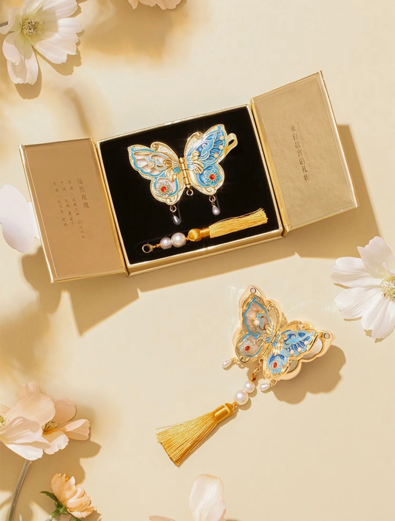 - 设计灵感:设计灵感源自清代银烧蓝蝴蝶式盒、蝴蝶簪等故宫珍宝,将宫廷里的蝴蝶元素复刻成香膏盒,充满古典韵味。
