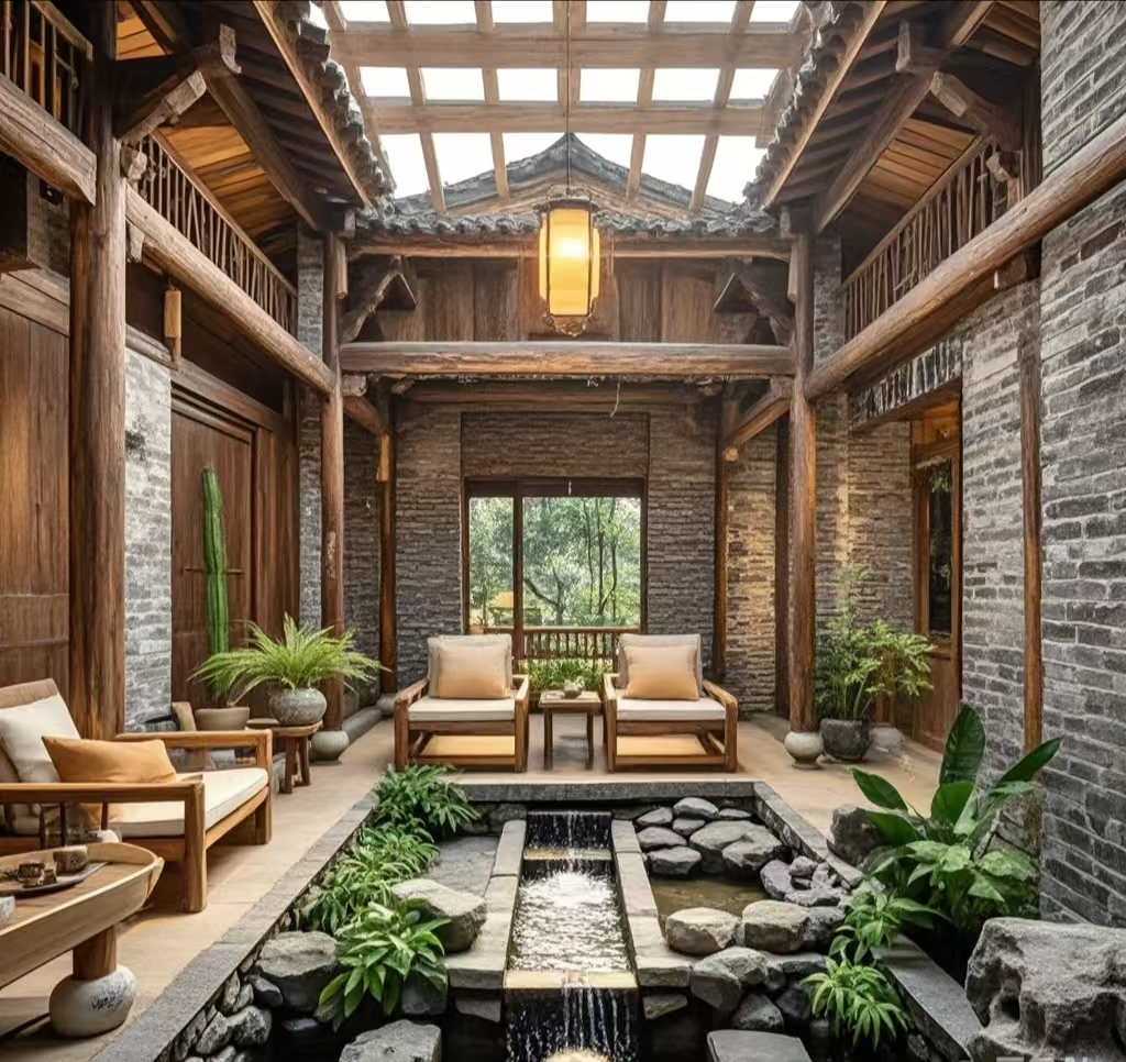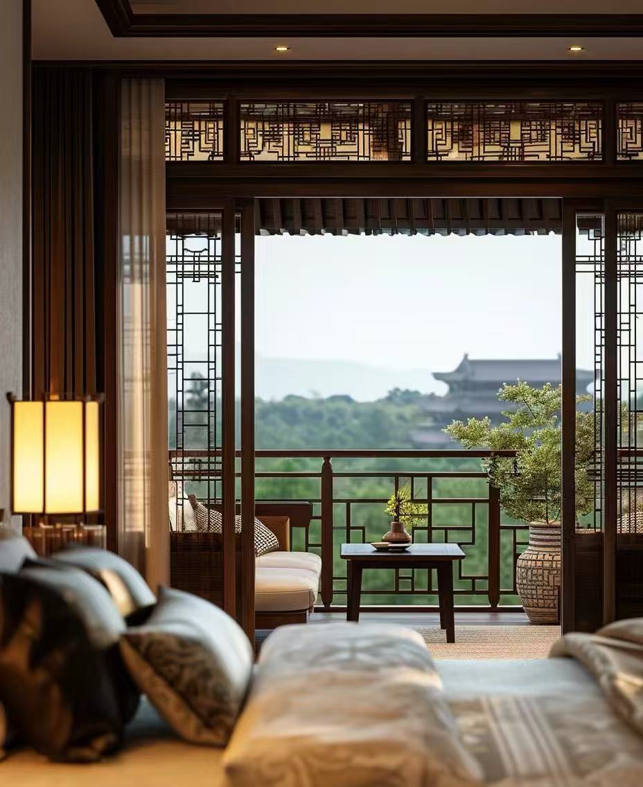 融合四川传统建筑特色与古典中式风格。建筑采用川西民居的青瓦白墙、木构穿斗,搭配雕花门窗和富有四川特色的装饰图案。