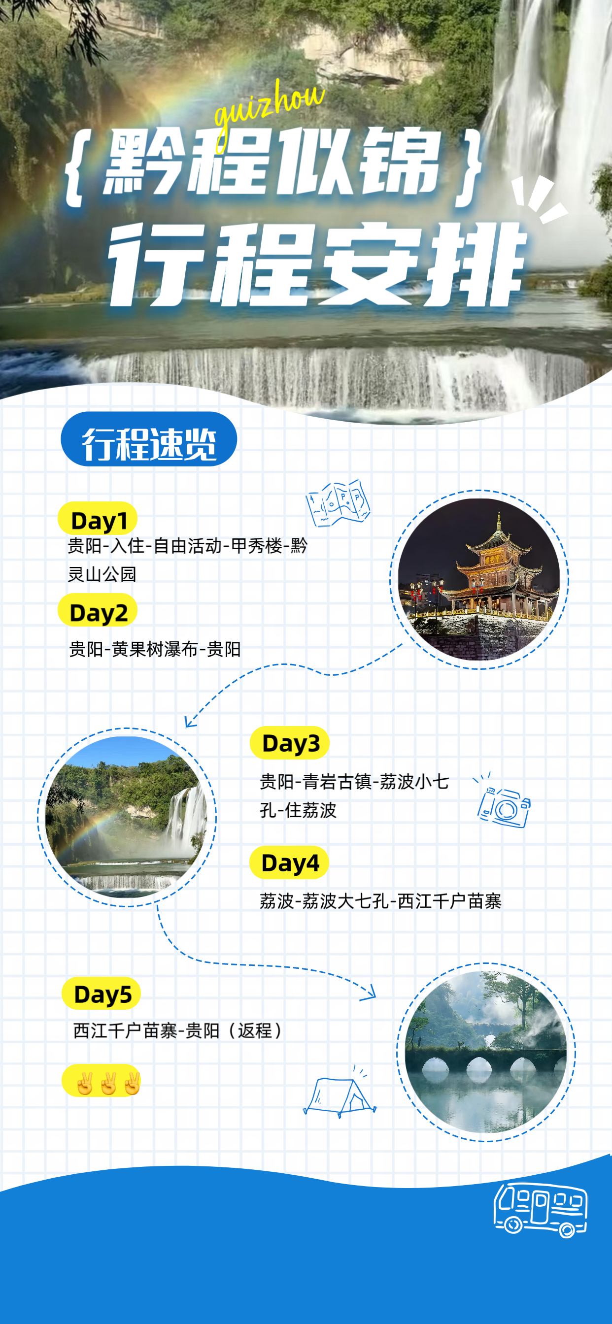 门票及地面项目 | 行程中所列景点包含黄果树景区门票,观光车及保险;青岩古镇,荔波大小七孔,西江千户苗寨 | 黄果树景区:成人270/人(儿童110/人) 青岩古镇:20/人 荔波大小七孔:170/人+游船70/人 |