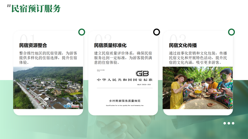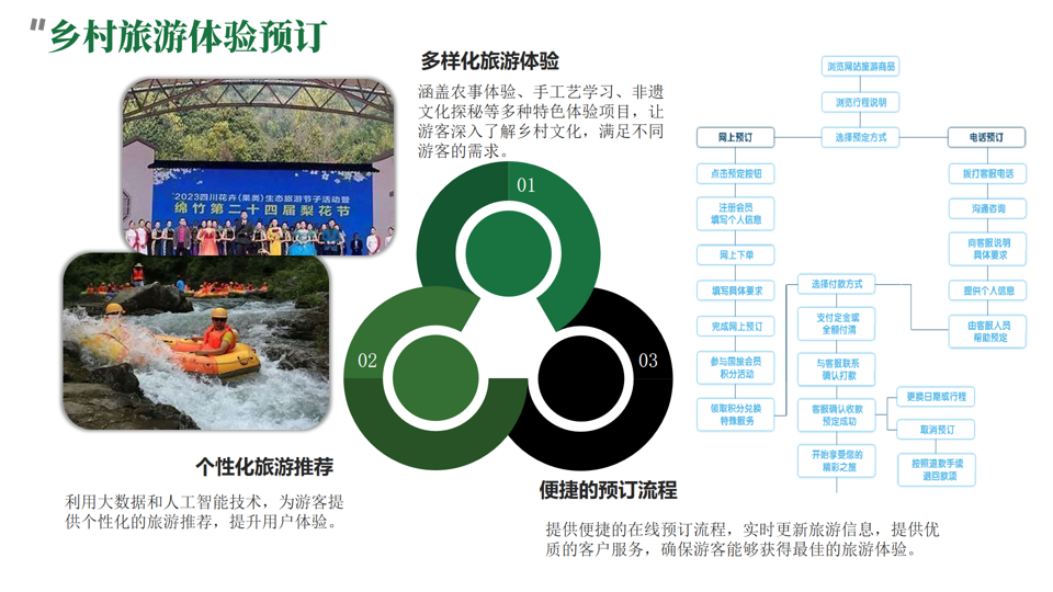 一个全面覆盖乡村旅游体验、农产品直销、特色民宿预订的综合性电商平台,深度融合地方文化与自然风光,提供超越预期的沉浸式体验。通过数字技术和文化创意,促进绵竹市乡村经济振兴,挖掘并传播当地非遗文化,为游客提供更深层次的文化体验,吸引国内外游客,推动区域可持续发展。