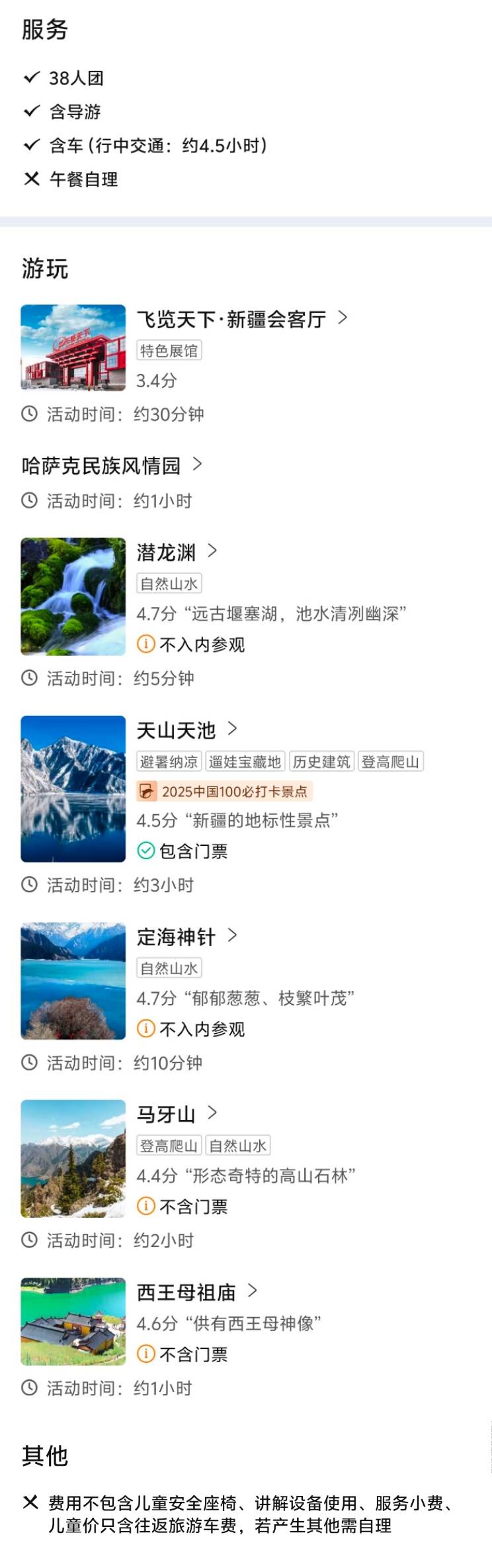 | 经典大巴团(成人含门票区间车) | 新疆天山天池一日游【纯玩品质+多点集合+多种玩法】 | 提前1天23:00前 |
