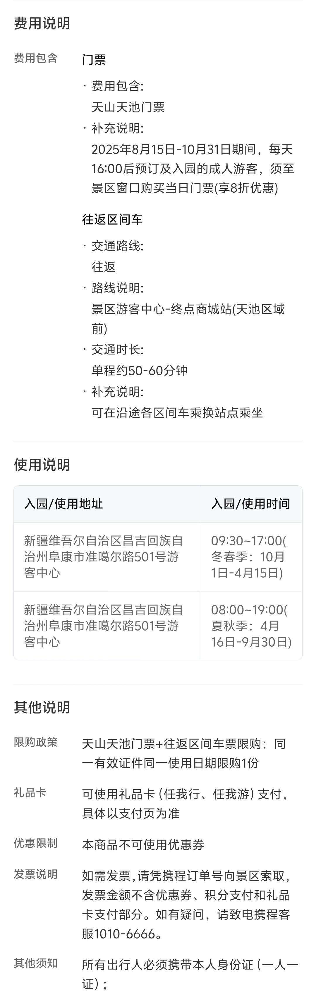 | 成人票 | 天山天池门票+往返区间车票 | 提前1天17:00前 |