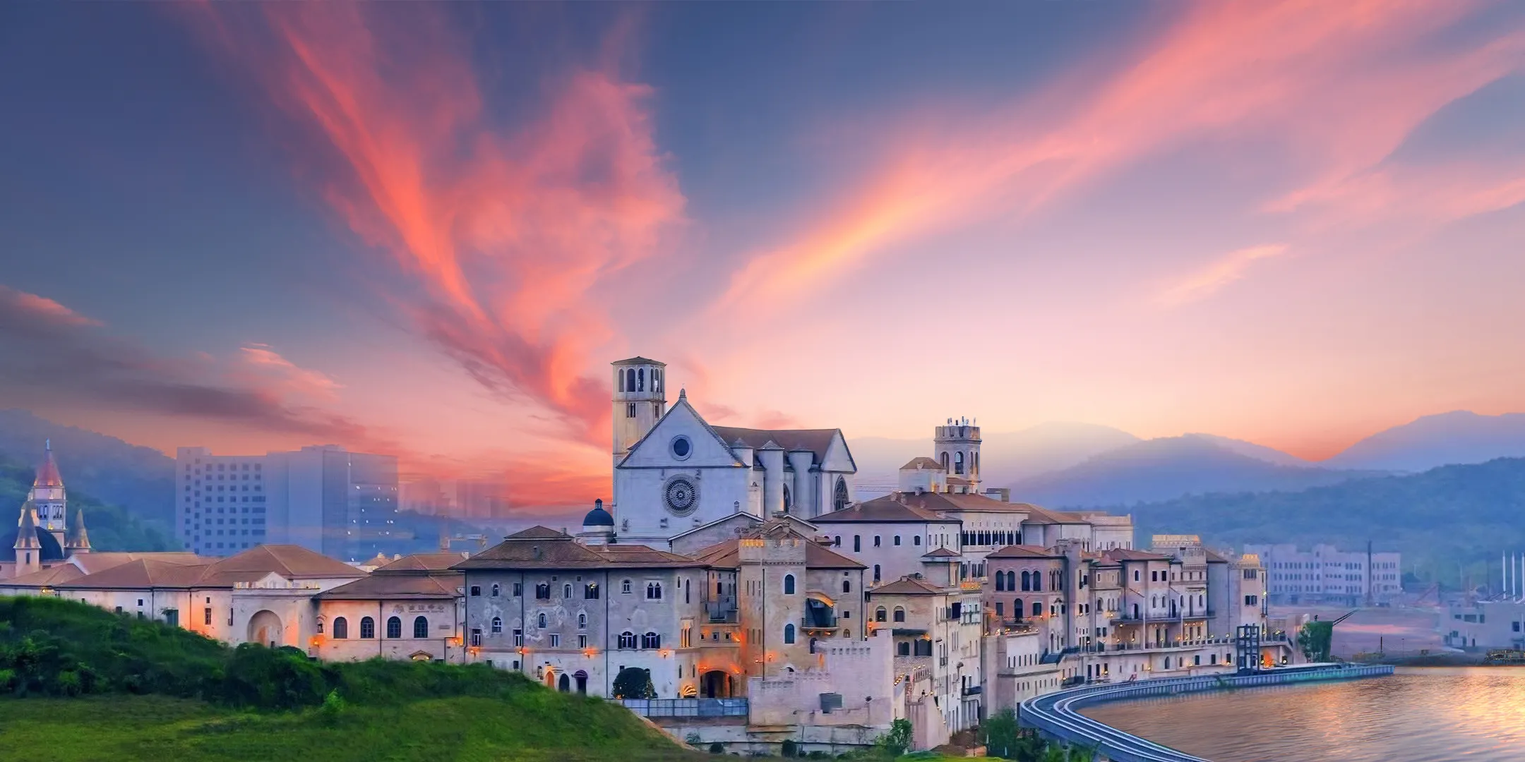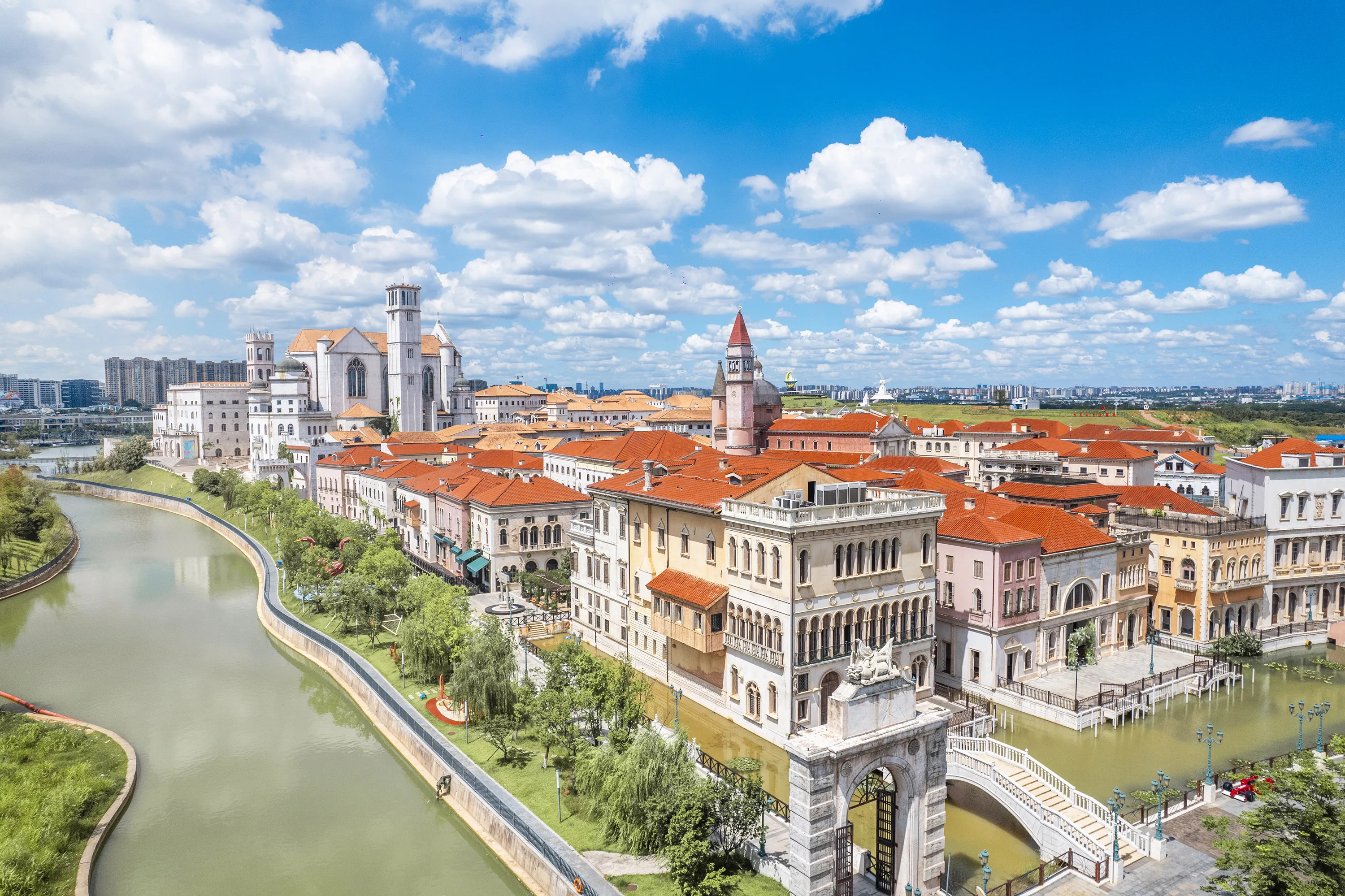 小镇分两期开发,一期为意大利小镇,1:1复刻了威尼斯水城、阿西西山城风貌,有35栋欧式建筑,包括圣弗朗西斯科城堡、贡多拉运河等。圣马可广场仿照意大利威尼斯的圣马可广场而建,教堂、钟楼、喷泉等元素一应俱全,充满了浓郁的欧式风情。威尼斯水街两岸是彩色的房子,游客可以租一艘小船,在河上划行,感受别样的浪漫。
