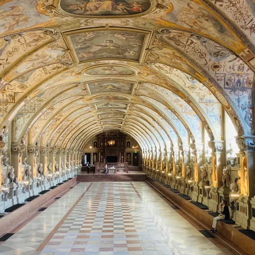 老宫殿(Alte Residenz):位于西侧,面朝王宫大街,呈巴洛克早期风格。殿内的帝王厅是王宫内最大的房间,用于举办重要仪式和庆典。古物馆是王宫最早建成的房间,展示巴伐利亚公爵Albert V的雕塑收藏。
