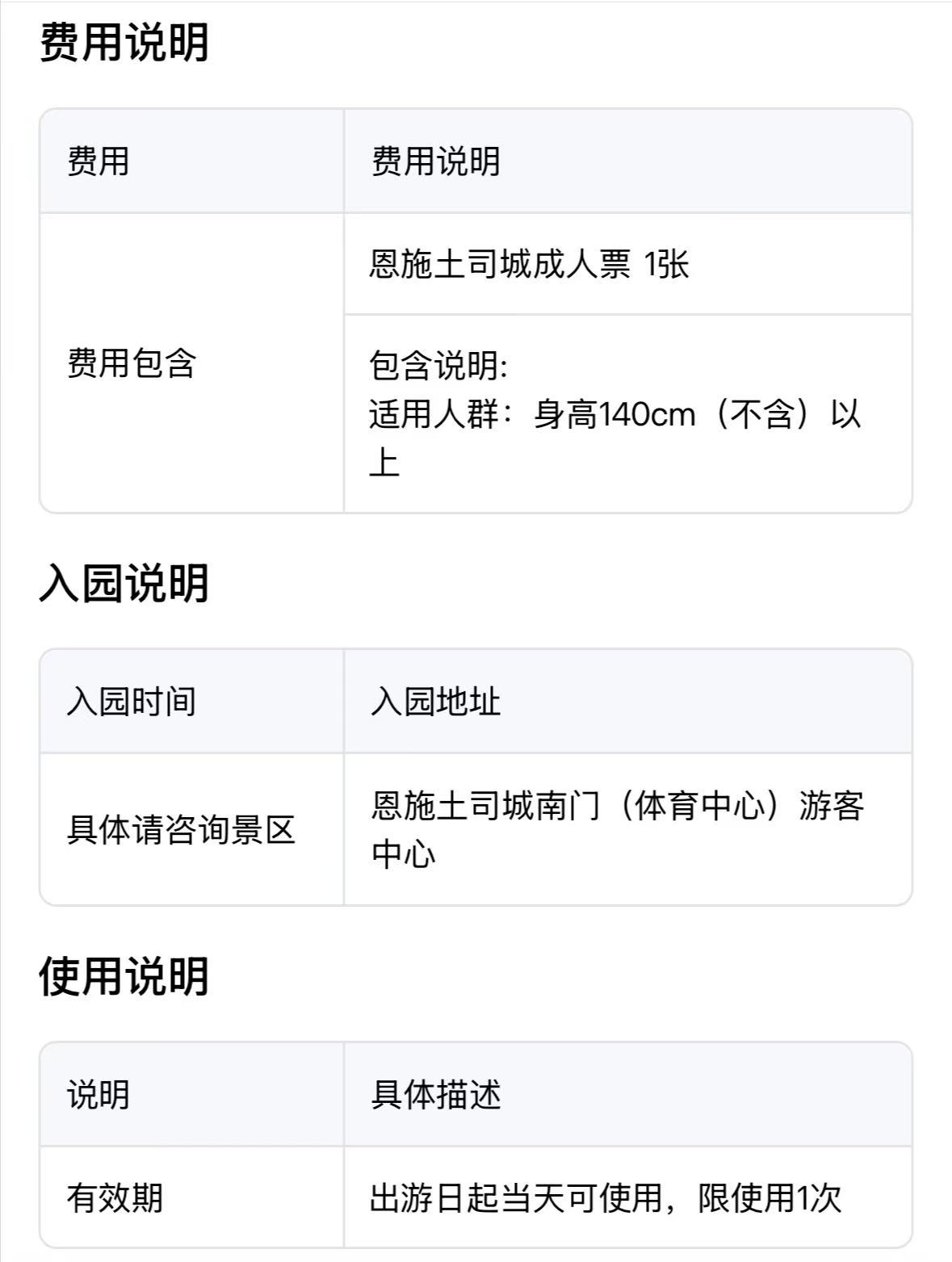 | 成人票 | 恩施土司城成人票 | 提前1天24:00前 |