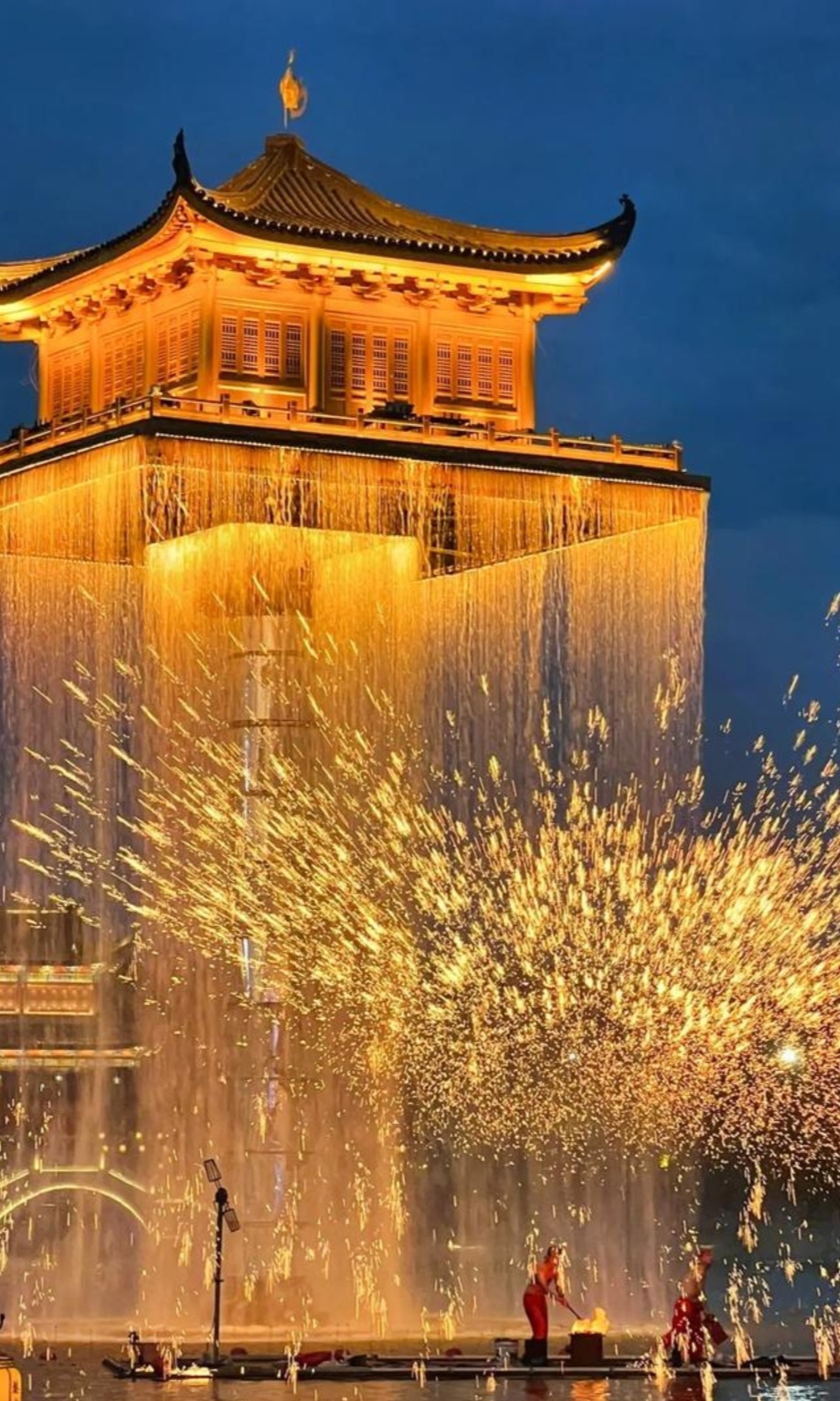 度假区以“婺女飞天”传说为背景,通过新徽派建筑、非遗技艺和实景演出,打造出“骨子里的徽州故事” 6。每晚的《遇见·婺源》大型实景演出,运用光影技术重现婺女传说,是度假区的核心项目。此外,抱玉塔的《天工开物》灯光秀、非遗打铁花和火壶表演等,将科技感与古风结合,极具视觉冲击力